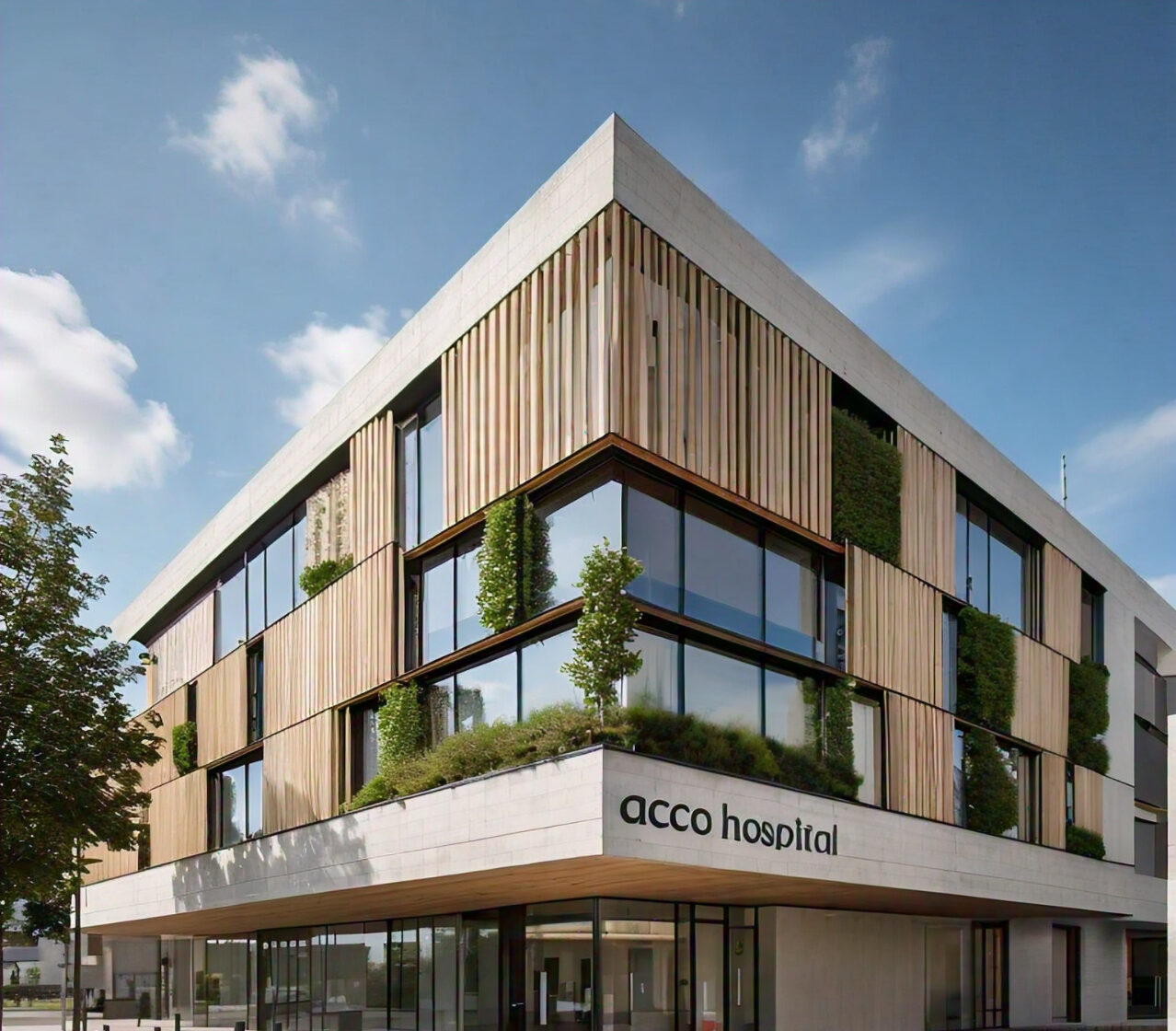 Sustainable hospital design reduces energy use and environmental impact. ACCO integrates eco-friendly systems such as: