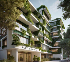 ACCO uses energy-efficient systems, solar integration, eco-friendly materials, and water recycling technologies in every healthcare project.