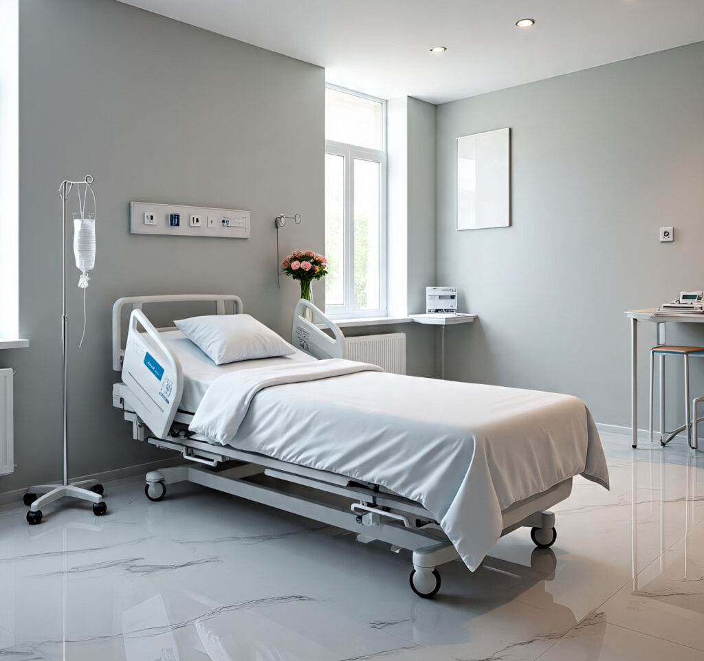 • Patient Rooms – Ergonomic beds, infection-resistant surfaces, natural light